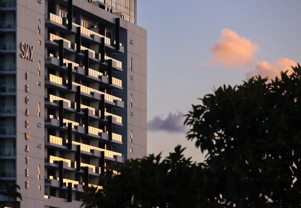 The lower part of the Sky Broadwater building in Southport, Gold Coast at sunset