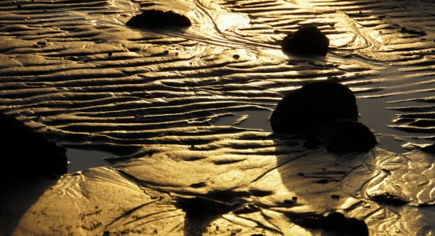 Sunrise highlights the tide marks on the beach bathing the sand in gold.