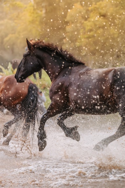 Black horse running through a river crossing nsw in the early brisk morning