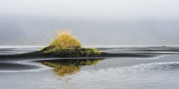 Stokksnes is the ultimate landscape location of Iceland. With the imposing Vestahorn mountains at the background, and a black sand beach with sand dunes as foreground. Reality was that when we got into location, the Vestahorn was covered by thick fog entirely. The whole beach was in a mystic twilight mist, and this sand dune composition was formed.