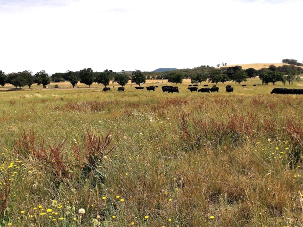 The multi toned and textured grass is the hero of this photo with Angus cattle in the distance.