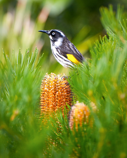A New Holland Honeyeater on one of the banksias in my garden