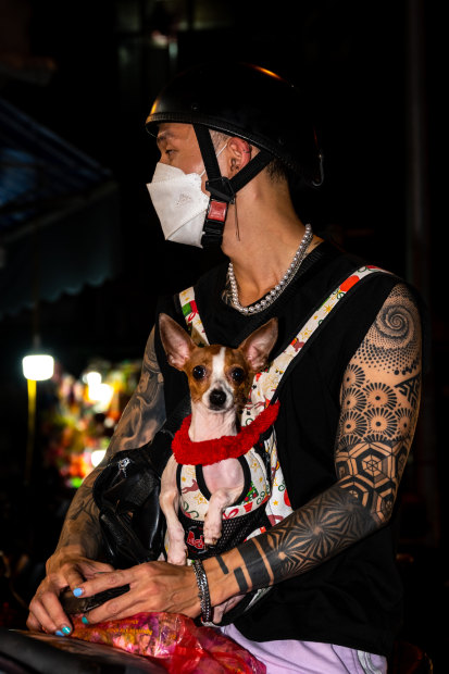 Street photography in Hanoi, Vietnam. I saw Mr Tuan on the streets of Hanoi, on his motorbike and with his cute little doggy.