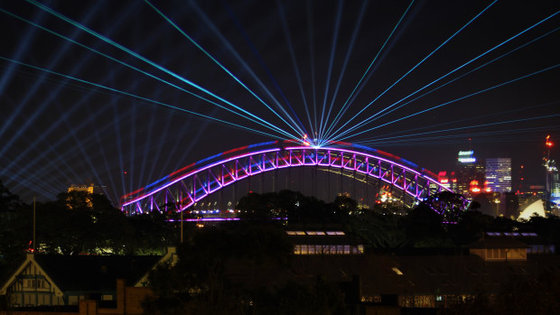 A long shutter speed of the iconic Harbour Bridge during the annual Vivid festival in Sydney.