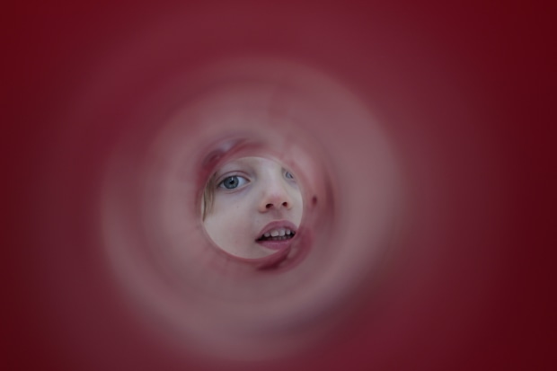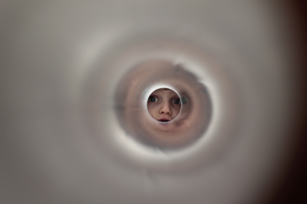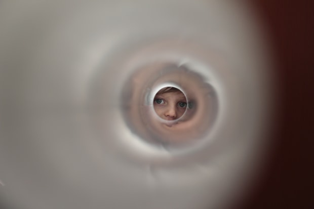 On a rainy day my four-year-old and I stayed home and played with some red and white PVC piping. The reflections and play of light made for some interesting effects.