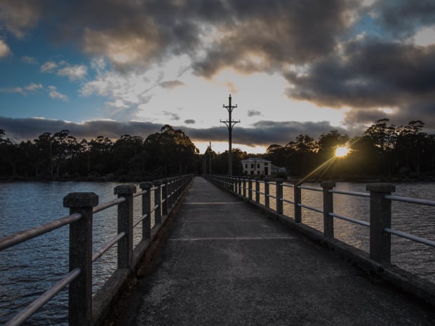Looking from the Pumphouse on Lake St Clair, Tasmania towards the Shorehouse. The earlier red sky had cleared and the sun peaked through a gap in the trees.
