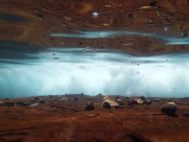 In nothing deeper than a few centimetres of water all sense of perspective becomes distorted and reality is altered through reflection, form and light.