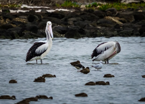 In the tidal shallows, Australian pelicans command the frame through stature alone, their pale forms rising above a dispersed gathering of smaller waterbirds. The photograph turns a quiet wetland encounter into a study of proportion in nature, where scale governs attention, establishes rhythm, and subtly orders the life of a shared habitat.