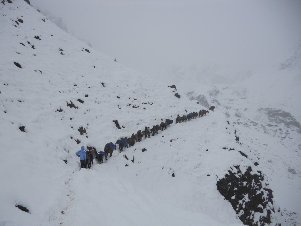 Our packhorses on the Snowman Trek in Bhutan make their way slowly through the deepening snow