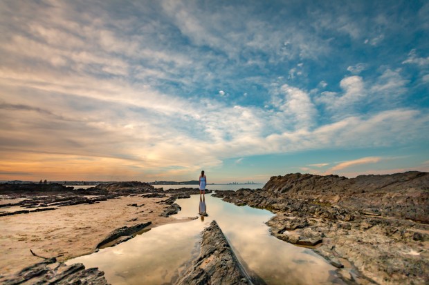 A girl stands on the rocks at Greenmount, looking out at the end of the day, at the end of holidays.
