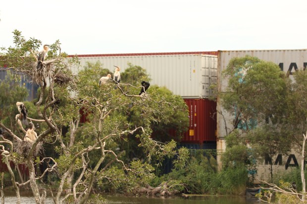 This shot shows the beauty of nature with this tree being home to some Australiasian darter nests along with some cormorants , but the shipping containers in the background question how long it will be until its no longer home.
