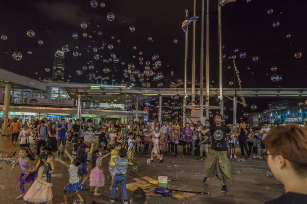 A traveler makes bubbles for the children in the bright lights of downtown Hong Kong at night. Just because it is night, doesn't mean it is all stars and moon light in a busy city.