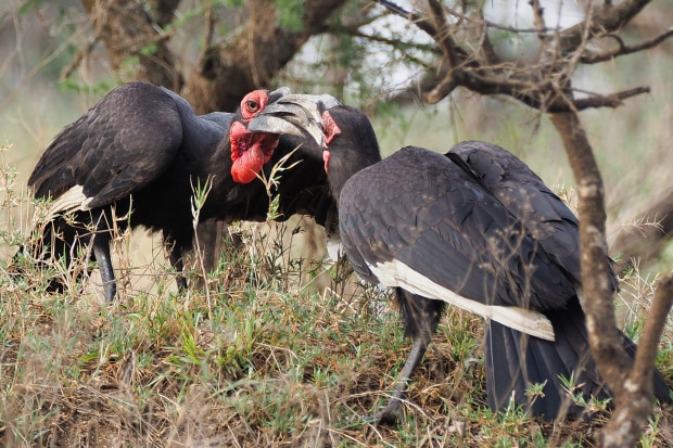 Competing for domination, two male Ground Hornbills lock their bills together, striving to get the upper hand. The Ground Hornbill is present across the Maasi Mara and Serengeti in Africa as well as into southern Africa, but is listed vulnerable and endangered in different parts.