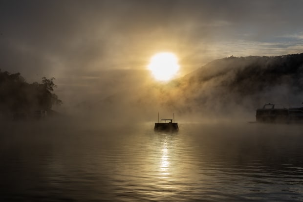 A barge caught in the fog, sunrise at Lake Eildon