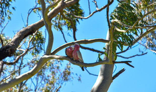A photo of two Australian pink galahs cleaning each other on the branch of a gum tree