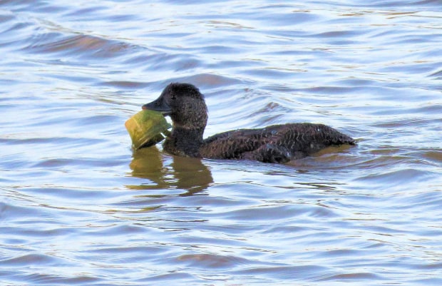 This musk duck was happy with yabbis before it come up with this plastic cap. very sad sight. Take it home .Taken in lake in Victoria