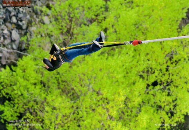 Doing the Kawarau bungy jump in Queenstown, NZ. I ended up waist deep in water!