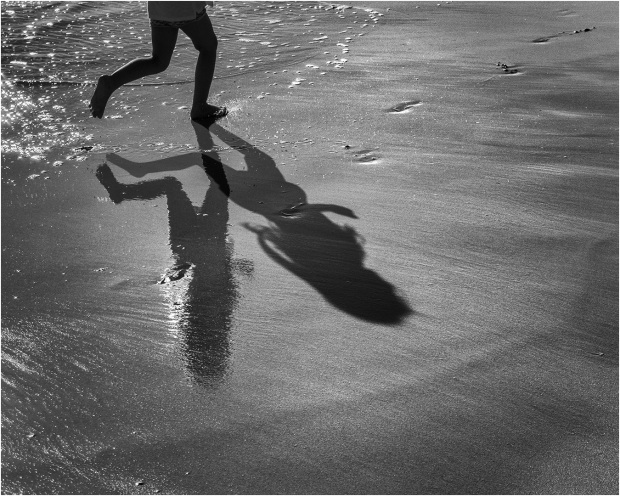 A shot of my youngest doing what she enjoys most - running in the surf and dodging the waves. Getting the angles right I was able to capture her shadow and reflection!