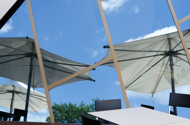 Taken at the Australian Museum, the image captures the reflection of the outdoor dining area in the windows. The disruption caused by the angular window frames adds to the effect.