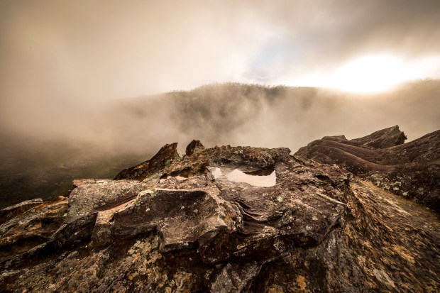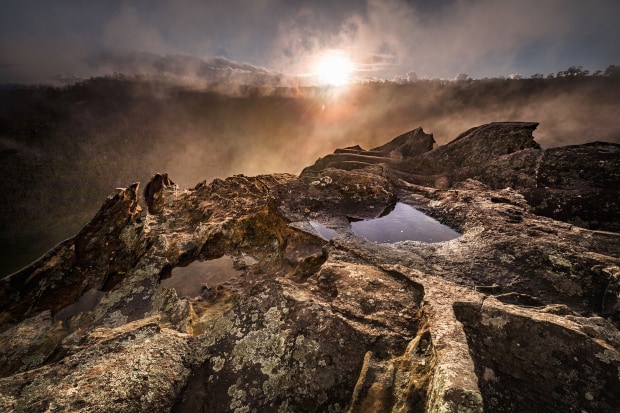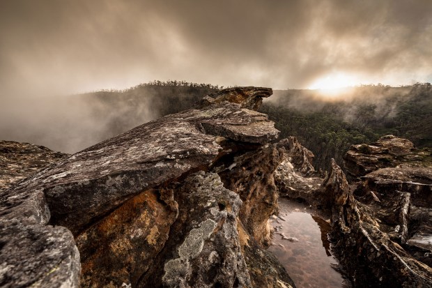 A prehistoric landscape, storm clouds rolling in, a fog and a setting sun - who knows what lies beyond . . . Mount Banks, Blue Mountains NSW