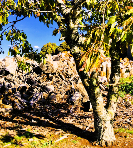 Live tree in front of the wood heap