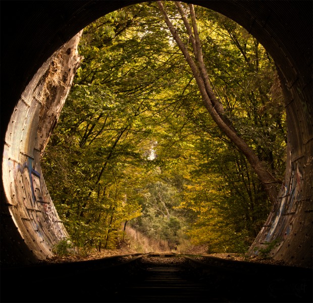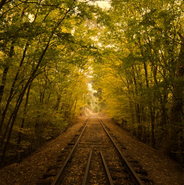Capturing the serene beauty of an old train line framed by the vibrant colors of Autumn. The rusty rails wind through a landscape adorned with red, orange, and yellow leaves, creating a picturesque scene of seasonal transformation. Each step along this quiet path invites reflection and appreciation of nature's fleeting beauty.
