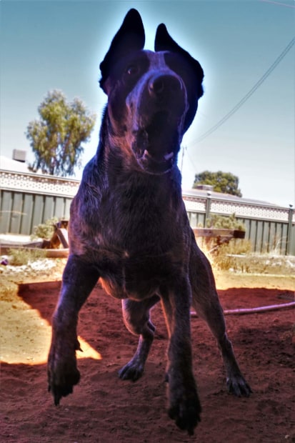 My blue heeler playing in front yard. Barking at me while I took his pictures