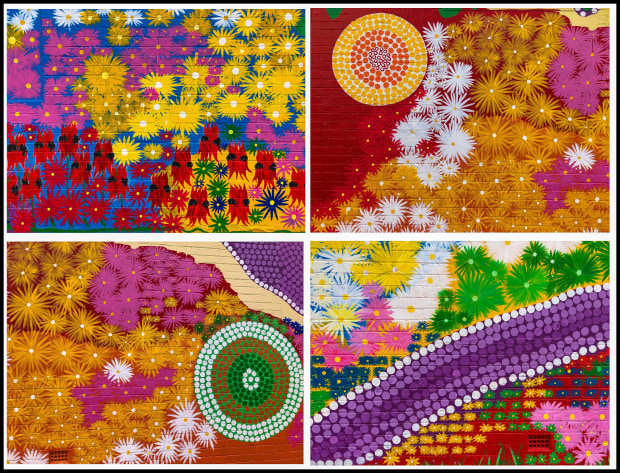 Colourful indigenous art painted on a brick wall in the centre of Kalgoorlie. Artists names unknown.