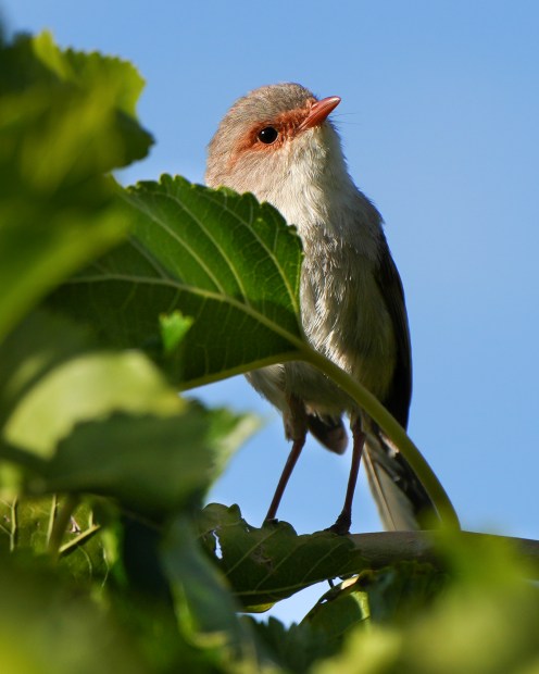 A female Superb Fairy Wren keeping lookout in the mulberry tree in my yard