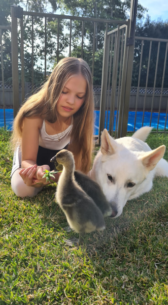 We were lucky enough to have hatched some goslings out of eggs and my daughter and our family dog were taking great care of them. It was amazing to see how gentle they both were with them and how much care they showed towards them.