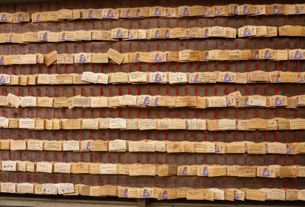 At temples in Japan, people write their wishes and desires on wooden discs and hang them at the shrine