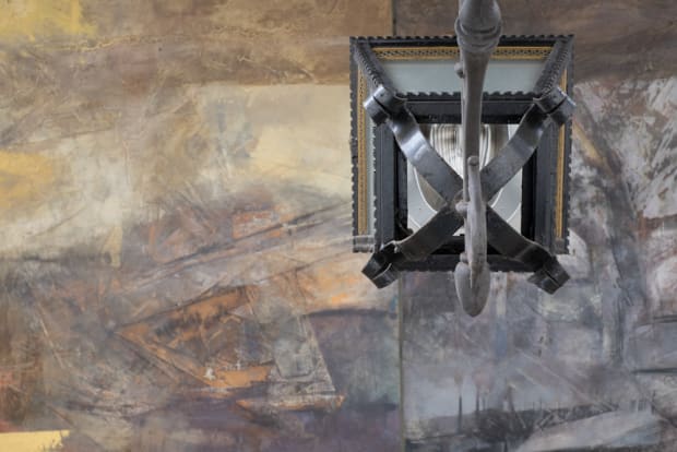 The passageway in Bilbao has interesting artwork painted on the ceiling. Together with the lamp photographed from below it makes for a pleasing (at least to me) image.