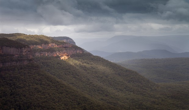 On a very dull and heavily overcast day, the chance to do some photography looked very unlikely. For a fleeting moment the cloud parted enough to allow a few rays of light to strike the western edge of Mount Blackheath. I barely had time to take a couple of images before the clouds closed in again and the light disappeared for the day. f/11, 1/20 sec, ISO-100, 105mm, Tripod, Exposure adjustment in Lightroom and PS.