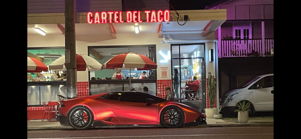 I was buying dinner opposite when I turned around to see this glorious red metallic car outside the red Taco sign and the purple hue next door complimented the scene. I took One Single shot of the scene without any filters.