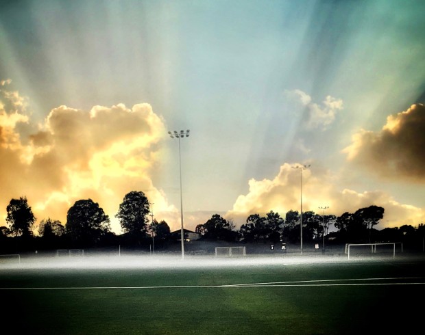 An image capturing the perfectly symmetrical layers of the grass, fog, run and clouds in the early hours of the morning.
