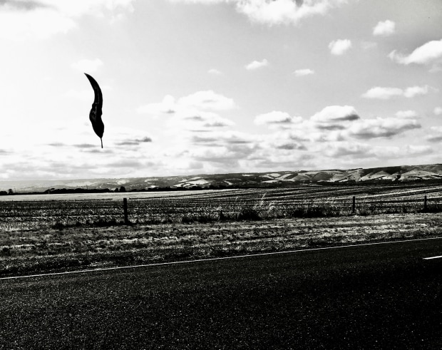 In this photo is the sky, hills, field, fence, ashphelt road. All a texture of a landscape cake! With a leaf that swirled up at the right moment.