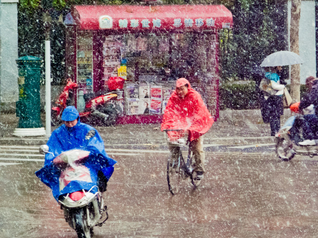 A street scene in Shanghai, during a snowfall