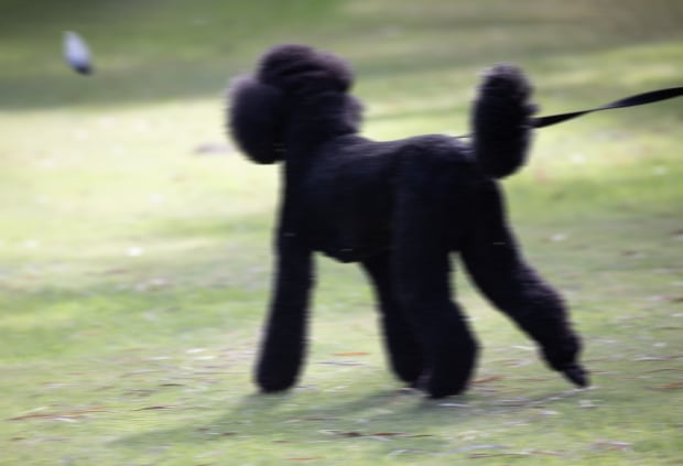 A Poodle lurches forward and strains against its leash in an attempt to chase the ball