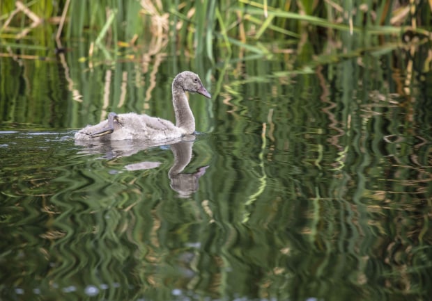 A cygnet follows siblings across the pond, their movement creating a surface blur.