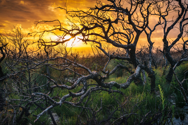 Many national parks in NSW were devastated by the bushfires of our Black Summer of 2019/20. After two years, there are many areas that are still showing little sign of regrowth. But there are some glimmers of hope…these images were taken as far afield as the Blue Mountains, Barrenjoey Headland and the Hanging Swamp at North Head, near Manly. Blackened gums but covered in new life… Alas the tree that looks all too human as it flails and falls backwards has fallen now, unable to recover from its wounds.