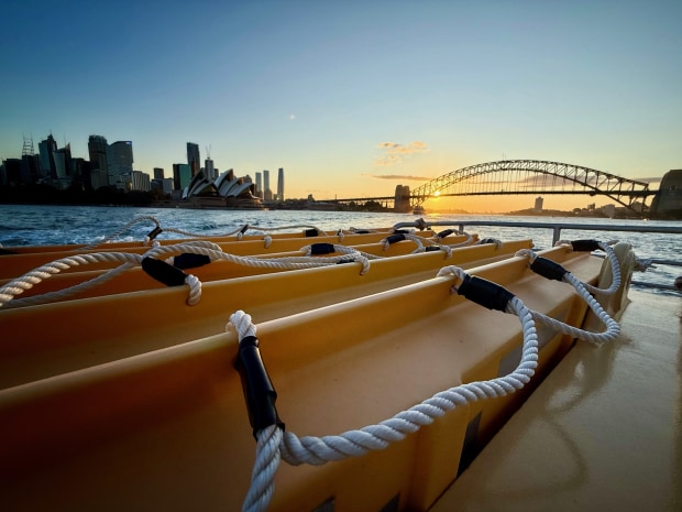 Ferry ropes and rafts catch the last gold light, leading the eye to Sydney’s Opera House and Harbour Bridge—where a working harbour meets an iconic city skyline.