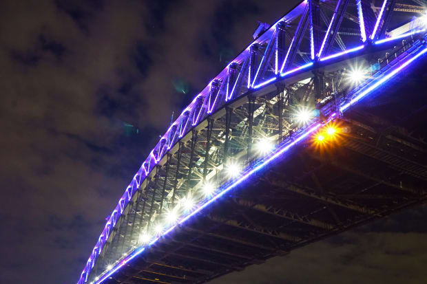Sydney Harbour Bridge lighted up in colours during Vivid
