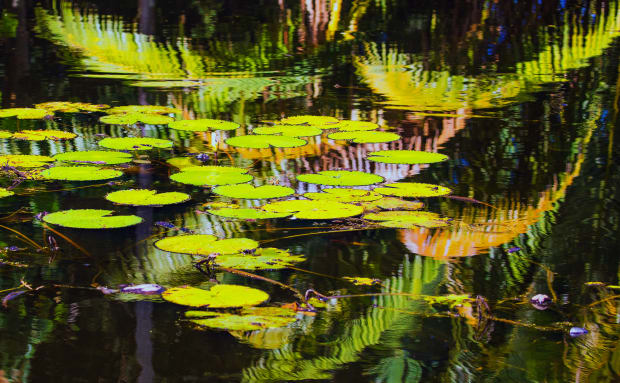 Centennial Lake, Cairns, with the lily pads surrounded by reflections of the palm trees