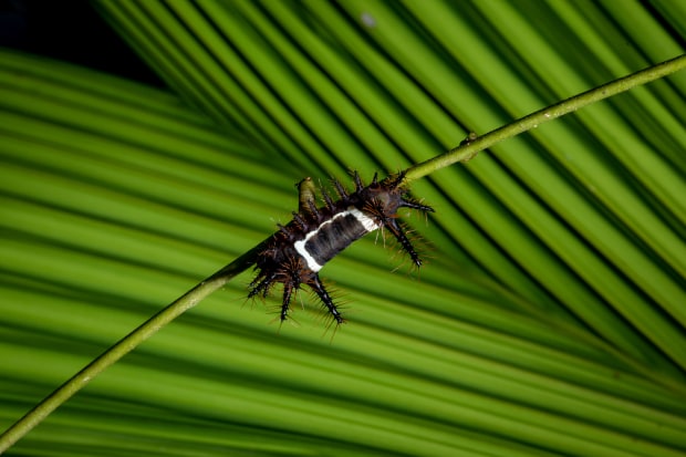 A hungry caterpillar makes its way to its next meal, oblivious to the leaf in the background offering a contrast to the square on his body.