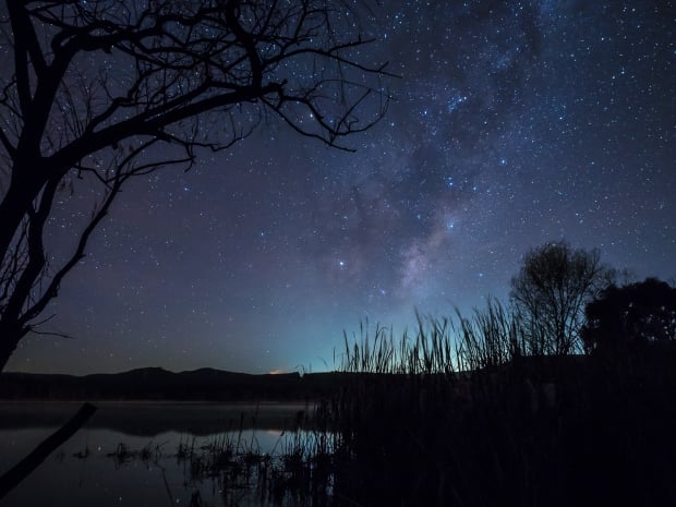 The Milky way - Scorpio and Saturn showing in the stars over Lake Wallace with the lights of Lithgow over the horizon