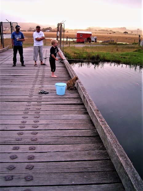 Fishing off a bridge with a cat , closely supervised by two adults.