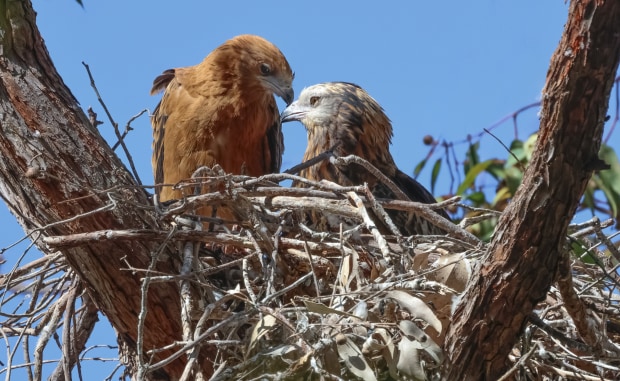 Mother and offspring share a moment in the nest. The female fledgling is almost ready to leave home.