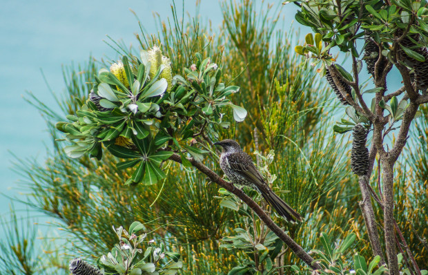A little wattlebird perched on a Banksia tree