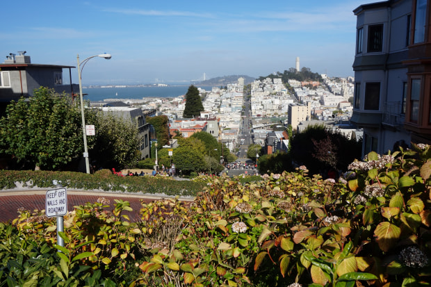 Looking Down from the Top of Lombard St San Francisco with Coit Tower and the Bay Bridge in the distance