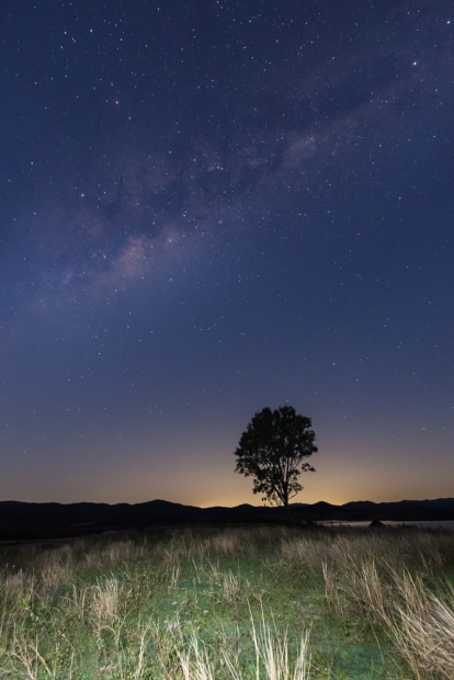 Driving home one evening near Lake Somerset recently I saw a beautiful sunset. This photograph was purposely taken during blue hour so the galactic centre visibility of the Milky Way was subtle. And then there was some light pollution from Brisbane coming over the horizon just behind this tree which gave it a nice silhouette. I had a speed light with me which I was using just to give the grassy fields a little bit of light. In hindsight I probably would of turned it down a bit as it looks harsh but the whole thing about photography is having fun and experimenting with light.